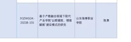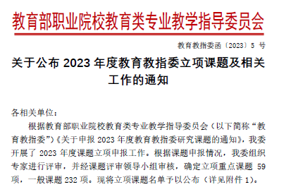4月26日,教育部职业院校教育类专业教学指导委员会(简称教育教指委)公布了2023年度教育教指委研究课题立项名单,我校陈勇老师申报的课题《基于产教融合视域下现代产业学院“以群建院、增值赋能”建设模式的研究》喜获立项。