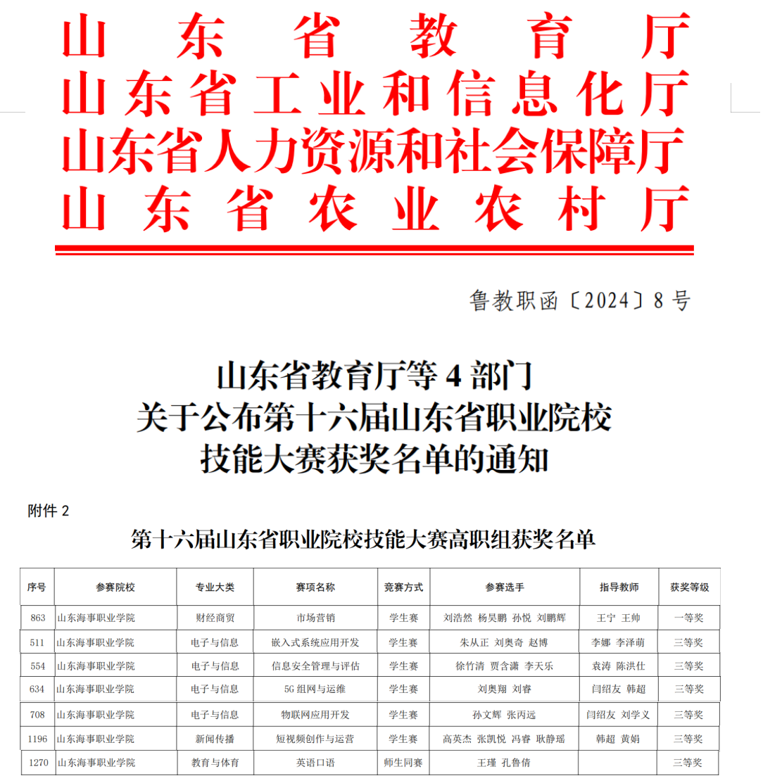 近日,山东省教育厅等4部门发布《关于公布第十六届山东省职业院校技能大赛获奖名单的通知》(鲁教职函〔2024〕8号),学校喜获一等奖1项,三等奖6项。