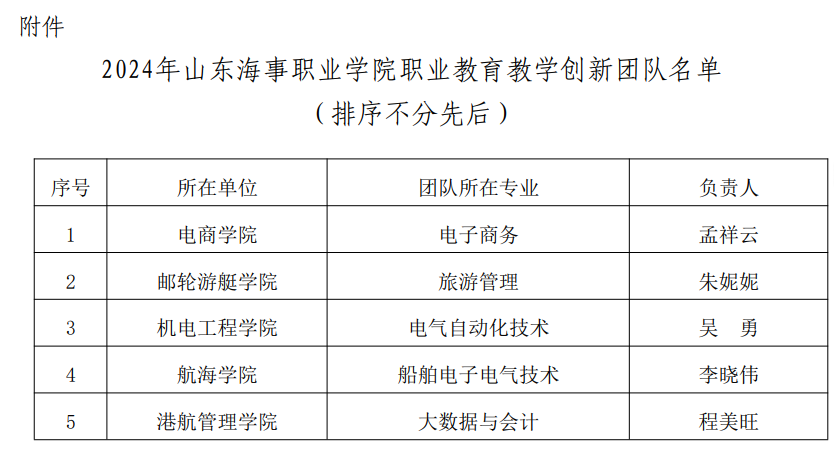 根据《九五至尊VI 关于申报2024年校级职业教育教学创新团队的通知》要求,经各教学单位推荐上报、专家评审等程序,拟确定5个专业教学团队为2024年校级职业教育教学创新团队,现将名单予以公布。