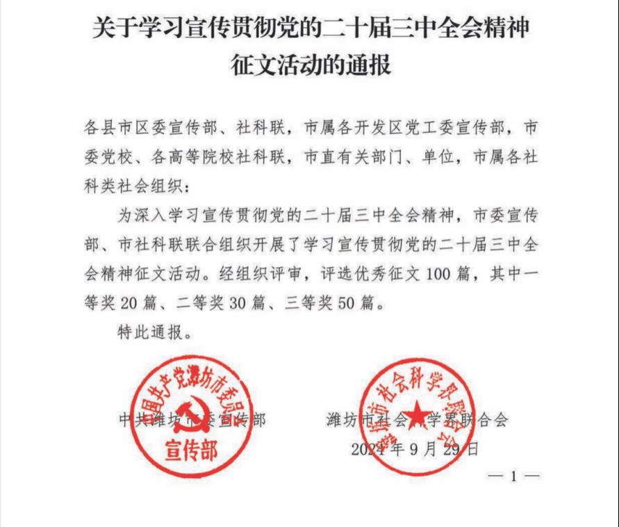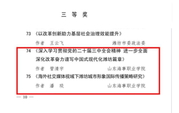 为深入学习宣传贯彻党的二十届三中全会精神,2024年8月,潍坊市委宣传部、潍坊市社会科学界联合会联合举办“学习宣传贯彻党的二十届三中全会精神征文活动”。我校认真组织、广泛动员、层层筛选,最终我校获得二等奖一项、三等奖两项。邮轮游艇学院徐萌老师撰写的《探索产教融合新路径,赋能民族邮轮产业高质量发展》获得二等奖;航海学院潘琰老师撰写的《海外社交媒体视域下潍坊城市形象国际传播策略研究》、基础教学部管清宇老师撰写的《深入学习贯彻党的二十届三中全会精神进一步全面深化改革奋力谱写中国式现代化潍坊篇章》分别获得三等奖。