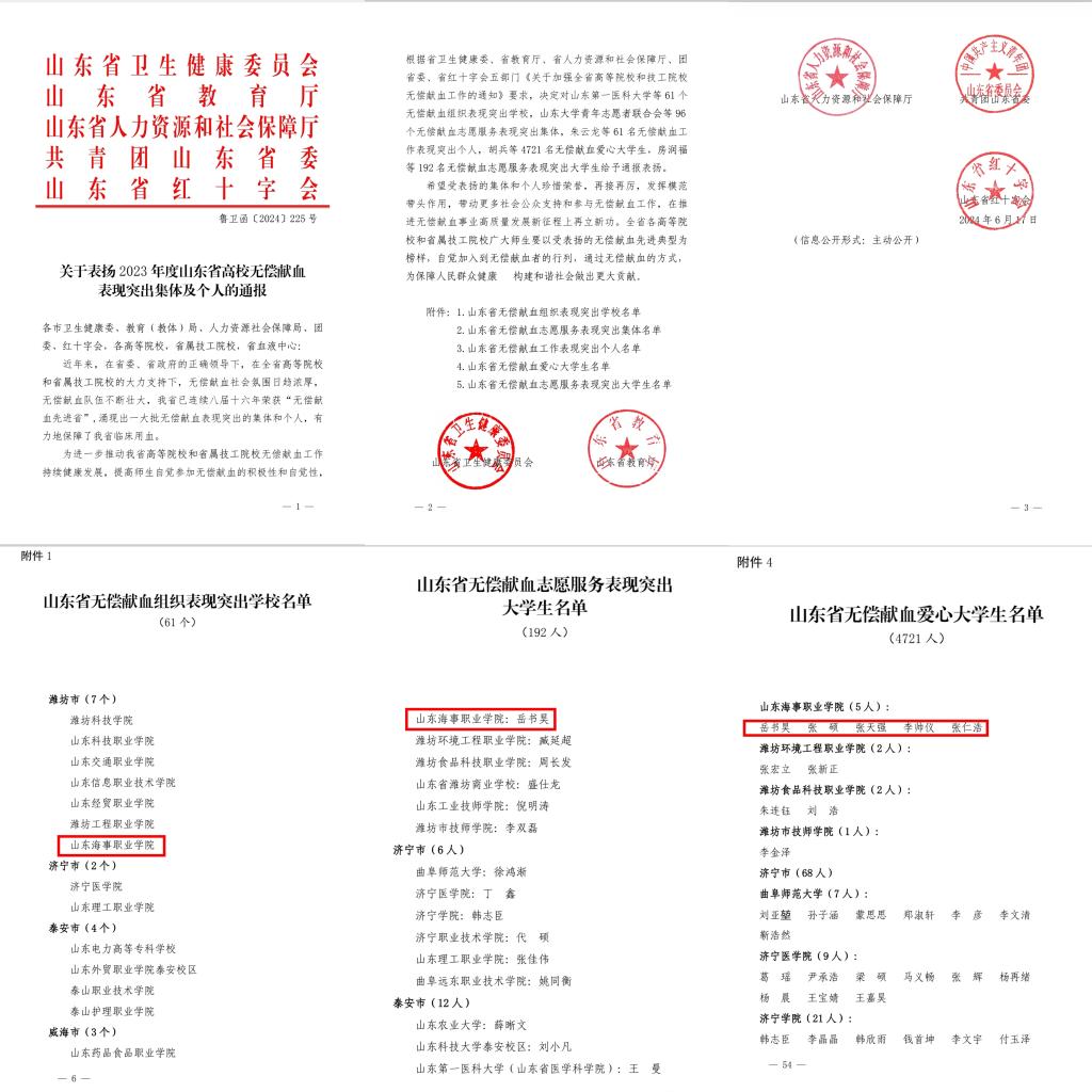 近日,省卫生健康委、省教育厅、省人力资源和社会保障厅、团省委、省红十字会联合发文,对2023年度无偿献血组织表现突出的集体和个人给予通报表扬。我校荣获山东省无偿献血组织表现突出学校;岳书昊、李帅仪、张硕、张天强、张仁浩5名同学荣获山东省无偿献血爱心大学生;岳书昊同学荣获山东省无偿献血志愿服务表现突出大学生荣誉称号。