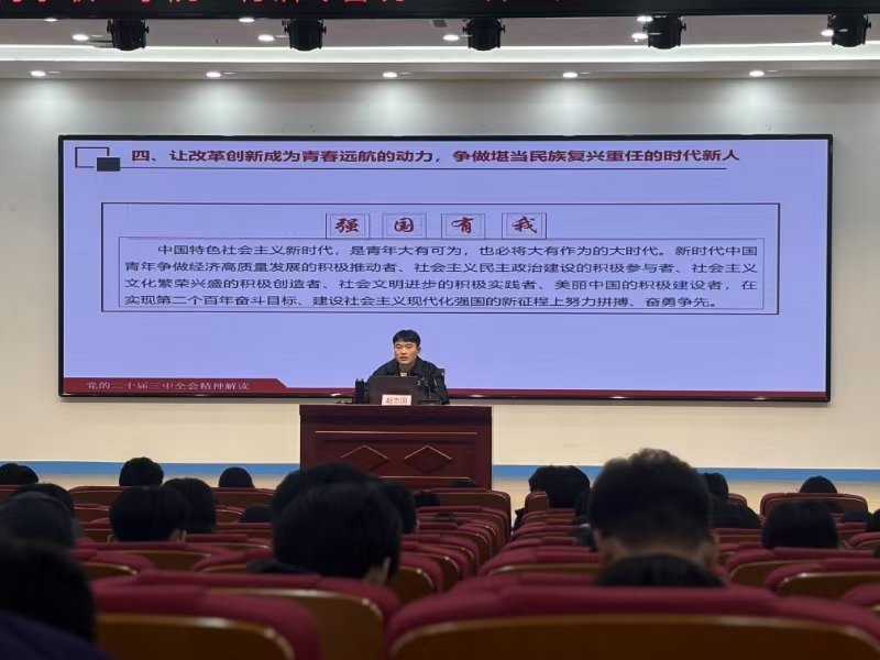 10月23日,学校在行政楼报告厅举行“青马工程”暨学生骨干培训班学习贯彻党的二十届三中全会精神宣讲报告会,各班班长、团支书300余人参加,马克思主义学院教师赵志国作宣讲报告。