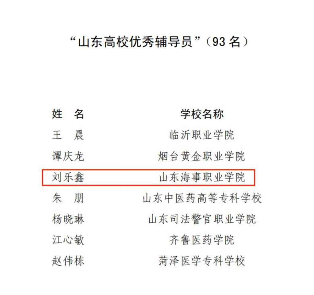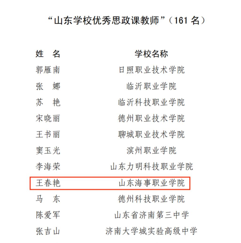 近日,中共山东省委教育工委公布2023年“山东学校思政课教师年度人物”“山东高校辅导员年度人物”评选结果,我校五年制大专学院院长王春艳同志获得2023年“山东学校优秀思政课教师”荣誉称号;邮轮游艇学院辅导员刘乐鑫同志获得2023年“山东高校优秀辅导员”荣誉称号。