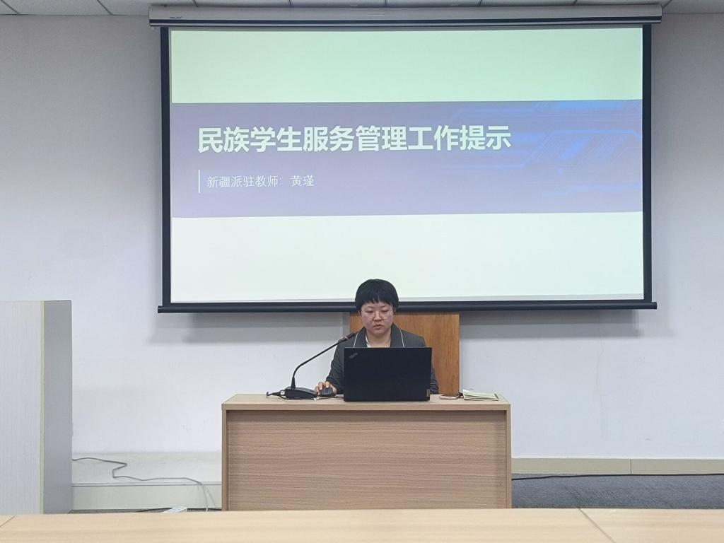 12月3日,学校在图书馆第二信息化教室为专兼职辅导员开展民族学生服务管理工作培训会议,新疆驻鲁工作组派驻教师黄瑾以“安全稳定筑根基,立德树人促融合”为主题,与在场辅导员进行交流。