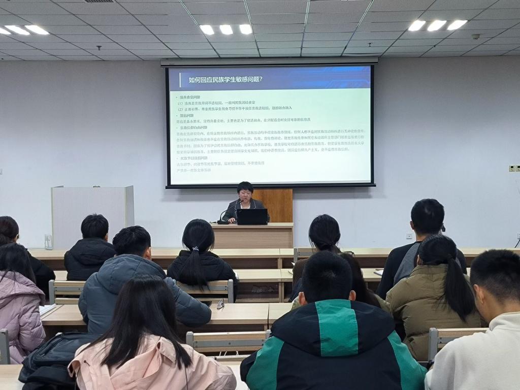 会上,黄瑾老师强调,在民族学生的管理上,要坚持“平等不特殊、关爱不放纵”的工作理念。在具体的学生工作中,要以筑牢中华民族共同体意识为主线,抓好民族学生的思想政治教育,积极引导学生,通过树立模范、发挥特色、突出亮点,促进学生的全面发展。