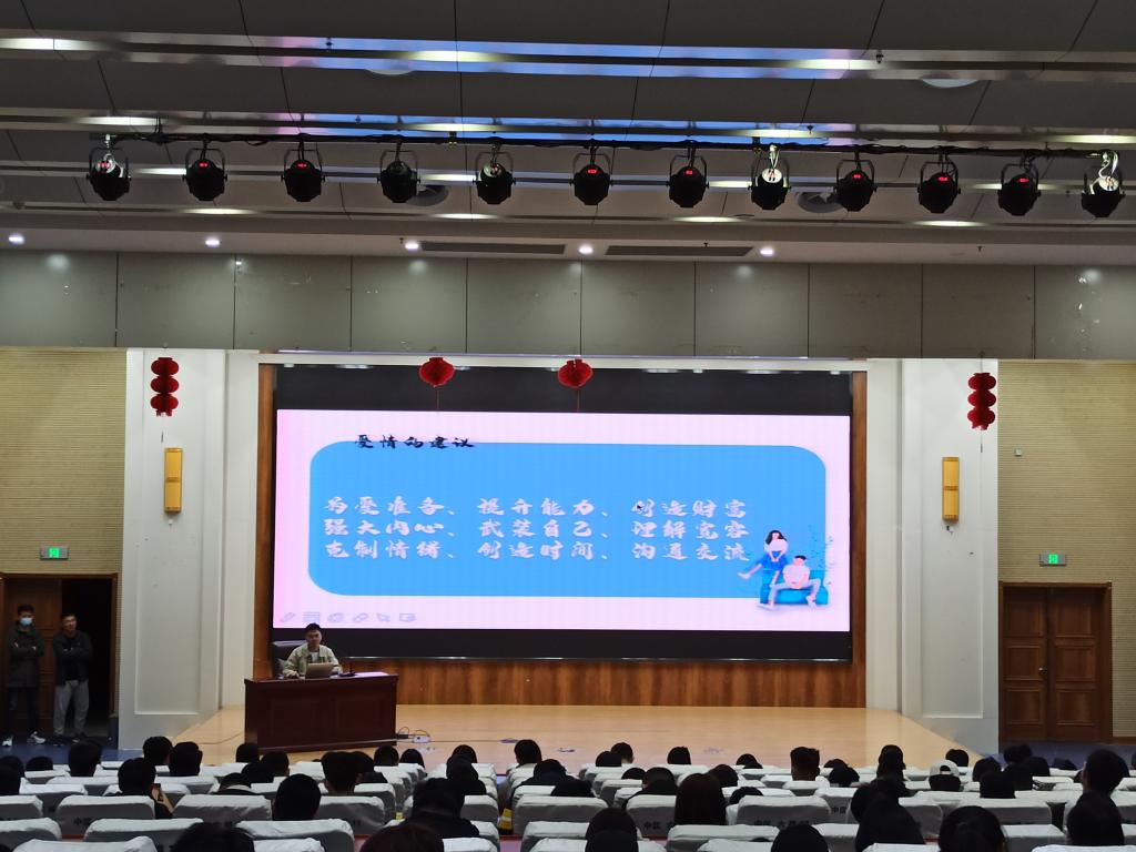 为创建和谐校园,针对我校本学期心理咨询室学生重点心理问题,我校大学生心理健康咨询中心于5月9日晚7点,在我校图书馆报告厅组织开展“525”大学生心理健康月专题讲座。讲座以“认识爱 理解爱 学会爱”为主题,以期引导学生树立正确的爱情观,促进学生全面协调发展。大学生心理健康咨询中心王鸿发老师为主讲人,各二级学院学生代表共同聆听本次心理健康讲座。