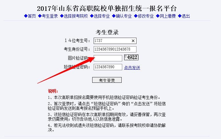 第二步:此时我们看到的是“2017年山东省高职院校单独招生统一报名平台”,用14位考生号、身份证号和手机短信验证码登陆: